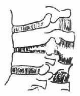 图73-9 过伸拉伸损伤 (七)综合性损伤 如楔状骨折加椎体后部骨折;爆裂型加椎体后部损伤。 在分类时,需仔细测量椎体前后缘的高度,椎弓根之间的距离,椎体的横径及棘突间距,并和上、下各一个椎体的测量相比较,进行准确分类。再根据分类,选择各自的合适的治疗方法。 四、脊柱骨折的治疗选择 我国对脊柱骨折的治疗有悠久的历史,1749年出版的中国医学巨著《医宗金鉴》中,对于治疗脊柱损伤的方法和器械的论述已较完善,也是国内外治疗脊柱骨折的最早记录。其中记述的“攀索叠砖”法,就已科学地采用自身重力牵引及脊柱后伸方法进行脊柱骨折的复位(图73-10)。在过去10多年里,在国外,脊柱骨折的治疗发展很快,1775年脊柱CT扫描的发展更促进了治疗的发展。国内目前还在普遍使用的老式脊突钢板(Holdworth钢板)由于不能满意复位骨折,而且固定不牢固,术后病人常残留腰痛,在北美已弃置不用,为比较先进的Harrington手术法、Lugue手术法、Galveston手术法及Steffee或Dick手术法等所取代。近几年来,北京协和医院和国内一些单位也已经逐渐开展应用上述新技术。
