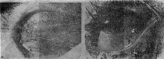图15-12 A.钝挫伤后出现低眼压,球结膜下出血,但无撕裂 B.手术探查时可见球结膜下巩膜破裂伤口 治疗:仔细检查裂口,尽可能做初期缝合术。然后根据条件进一步处理,如行玻璃体手术。如果眼球结构已遭到彻底破坏,无法缝合时,可慎行初期眼球摘除术。少数病人出现眼球破裂,但裂口隐蔽在结膜或直肌下、赤道前后甚至视神经周围,不能直观发现,称隐慝性巩膜破裂,应根据临床表现判断,做探查手术确诊和缝合。