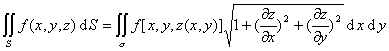 式中σ为曲面S在Oxy坐标面上的投影,z(x,y)为单值连续可微函数,函数f(x,y,z)在曲面S的各点上有定义并连续,则