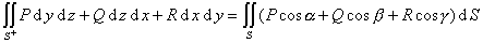 为它的正面,即由法线方向n(cosα, cosβ,cosγ)所确定的一侧,P=P(x,y,z),Q=Q(x,y,z),R=R(x,y,z)为在曲面S上有定义并且连续的函数,则