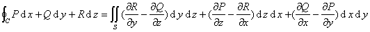 [斯托克斯公式] 若C是包围逐片光滑有界双侧曲面S的逐段光滑简单闭曲线,P=P(x,y,z),Q=Q(x,y,z),R=R(x,y,z)是在S+C上连续可微函数,则