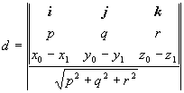 式中d为点M(x0, y0, z0)到直线L的距离,ijk为三个坐标轴上的单位矢量,最外面的符号“| |”表示矢量的模