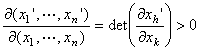 [可定向流形]  假定n维实数空间里的一点的一个邻域被一个拓扑变换f变上一点的一个邻域,即f=.如果f可逆连续微分,并且雅可比式