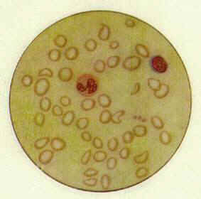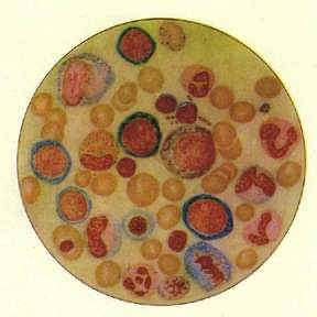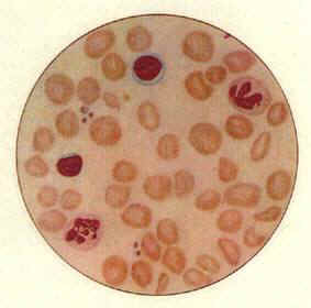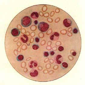 图6—9 营养性大细胞性贫血骨髓象 注:原红细胞及早幼红细胞细胞数增加,胞体增大,胞核染色质粗、松 1.原红细胞 2.早幼红细胞 3.中幼红细胞 4.晚幼红细胞[其中一个含豪-若氏(Howell-Jolly)小体] 5.分裂型红细胞 6.嗜碱性点彩红细胞 7.原粒细胞 8.是幼粒细胞9.中性晚幼粒细胞 10.中必晚幼粒细胞11.中性杆状粒细胞12.中性分叶粒细胞 13.嗜酸性晚幼粒细胞 14.淋巴细胞 15.血小板16.巨血小板 (三)对症治疗 发生震颤者应给少量镇静剂。如震颤影响呼吸者应给氧气吸入。