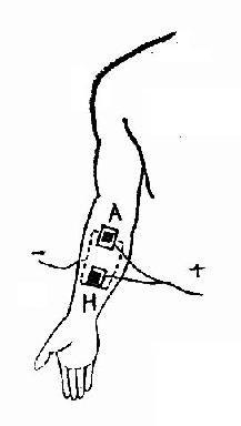 二、直流电药物离子导入的原理在药物溶液中,一部分药物离解成离子,在直流电的作用下,阴离子和阳离子进行定向移动。如果阴极衬垫中含有带负电荷的药物离子或者阳极衬垫中含有带正电荷的药物离子,就会向人体方向移动而进入体内。 (一) 肾上腺素组织胺导入试验 两个小电极和一个大电极放置在右侧前臂上(图2.2.1),A电极衬垫用0.01%盐酸肾上腺素液浸湿,而H电极用0.01%磷酸组织胺液浸湿,都连阳极。右臂伸侧电极衬垫用肾上腺素或组织胺液浸湿,连阴极,通电10分钟后,取下电极观察局部皮肤。A电极下皮肤出现苍白斑点,提示肾上腺素已进入体内并引起反应;H电极下皮肤明显充血、水肿,出现荨麻疹,证明组织胺已进入人体,右臂伸侧电极下皮肤则元些反应,表示药物没有进入皮肤。 以上试验说明: 1.根据同性电荷相斥,异性电荷相吸原理,利用直流电能将药物离子经完整皮肤导入体内。 2.由直流电导入体内的药物保持原有的药理性质。 3.阳离子只能从阳极导入,阴离子只能从阴极导入。 (二) 药物导入人体的途径分布深度用数量 已经证明,药物离子主要经过皮肤汗腺管口和毛孔进入皮内(图2.2.2)或经过粘膜上皮细胞间隙进入粘膜组织。汗腺导管内径15~80μ,所以蛋白质(1~100mμ)等于大分子物质的离子了也能经过汗孔导入体内。;在电场中离子移动速度很慢。实验证明,谷氨酸在生理溶液内(ph 7.45,电压180V,电流强度3mA)每小时移动13mm,而在人体组织内每小时只有数毫米。直流电直接导入离子只达皮内,主要堆积在表皮内形成“离子堆”,以后通过渗透作用逐渐进入淋巴和血液。进入血液循环后,有的药物选择性地停留在某器官组织内,如碘主要停留在申状腺;磷蓄积在中枢神经系统和骨骼中等。