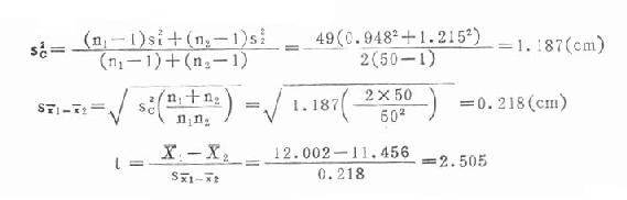 本例自由度v=n1+n2-2=98,查t界值表[表内自由度一栏无98,可用内插法(从略)或用v =100估计]。T0.05(100)=1.948,t0.01(100)=2.626,今t=2.505>t0.05(1000,P<0.05,按α=0.05检验水准拒绝H0,接受H1,可认为广西瑶族和侗族妇女骨盆入口前后径不同,前者大于后者。
