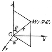 r为矢径长(OM),j 为经度,q 为纬度(或极距角) 这里 0 £ r < ¥ - ¥ < j < ¥ 0 £ q £ p |