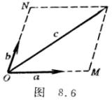 把矢量的始点移到原点O,以ab为边作平行四边行,由原点作出的对角线就表示和矢量ab(称为平行四边形法则,见图8.2);或者把二矢量首尾相接,由始点到终点的矢量即为和矢量a+b(称为三角形法则,见图8.3).