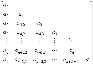 (n+2)方阵的对角线上列出a0,a1,L,an,d(d为符号),在第1列上列出a0(即ai,i=ai-1,i=1,2,L,n+1;an+2,n+2=d;ai,1=a0,i=1,2,L,n+2).
