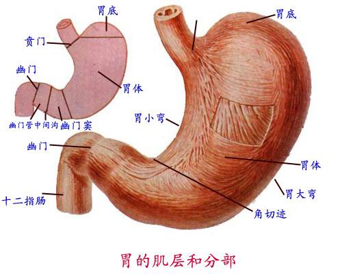 分四部,即贲门部、胃底、胃体和幽门部。 Four points, namely cardia, fundus, body and pylorus of the stomach. 幽门部临床也称胃窦,分幽门窦和幽门管两部。 Pyloric antrum, also known as clinical, sub pyloric antrum and pyloric two.