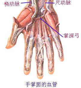 (4)掌浅弓和掌深弓:由尺、桡动脉的终末分支,互相吻合而成。 (4) the superficial palmar arch and deep palmar arch: by foot, the terminal branches of the radial artery, consistent with each other together.