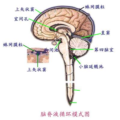左、右侧脑室脉络丛 经室间孔 →第三脑室 经中脑水管 →第四脑室 经正中孔、外侧孔 →蛛网膜下隙→蛛网膜粒→上矢状窦→窦汇→左右横窦→左右乙状窦→颈内静脉。 Left and right lateral ventricle choroid plexus - between the third ventricle through the foramen - through the cerebral aqueduct → fourth ventricle - by the middle of the hole, lateral sinus sink hole sagittal sinus → → → → subarachnoid subarachnoid on grain → left transverse sinus → around within the sigmoid sinus → jugular vein.