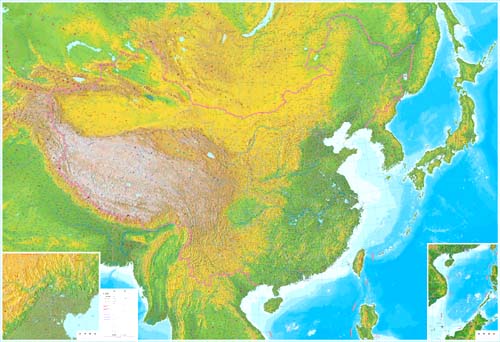 The area 9.6 million square kilometers, are the Asian territory area biggest countries, in the world multitudinous country, is only inferior to Russia and Canada, occupies the world third. North the Chinese territory Mohe River by the northern Heilongjiang middle of a river, south to Nansha Islands' zengmu reef, the north and south is distanced 5,500 kilometers; East gets up Heilongjiang and Wusuli River convergence place. West to the Pamirs, the thing is distanced 5,200 kilometers. Land boundary long approximately 22,800 kilometers. Mainland China eastern part and south borders on Bohai Sea, Yellow Sea, East China Sea and the South China Sea. Sea area area approximately 4.73 million square kilometers. Islands 5,400, the islands total area is 38,700 square kilometers. China sea waterfront total length 32,000 kilometers, continental sea waterfront 18,000 kilometers, islands coastline 14,000 kilometers. West the Chinese topography Gao Dongdi assumes the steps and ladders shape to drop by the level. The highest level of steps and ladders are the Qinghai-Tibet Plain, above the average elevation 4,000 meters, is known as "the roof of the world". The second level of steps and ladders by inner Mongolian plain, the loess plateau, the Yunnan-Guizhou Plateau and the Tarim basin, accurate Ge you the basin, the sichuan pendi constitute, average elevation 1,000 meters to 2,000 meters. From Daxinanling, Mount Taihang, Wushan and the snowy peak piedmont to the east to the coastline, the topography drop to the elevation 500 to 1,000 meters for the third level of steps and ladders. The fourth level of steps and ladders are the Chinese continental shelf shallow sea area, the water depth equally not to 200 meters. The national each kind of terrain percentage is: The mountainous region accounts for 33%, the plateau accounts for 26%, the knoll accounts for 10%, the basin accounts for 19%, the plain accounts for 12%.