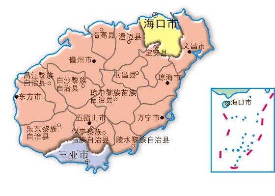 The Hainan Province land area more than 34,000 square kilometers, the entire province governs 2 places levels city, 4 municipal districts, 6 county level cities, 4 counties, 6 autonomous counties, the altogether 181 towns, 20 townships, 17 subdistrict offices, the provincial capital is a seaport.