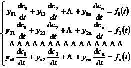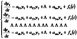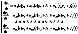 where a ik ( t ) and f i ( t ) ( ) are both known continuous functions of the independent variable t . If at least one f i ( t ) is not equal to zero, then (1) is called an inhomogeneous linear differential System of equations . If all f i ( t ) are equal to zero, then (1) is called a system of homogeneous linear differential equations, and its general form is