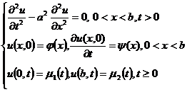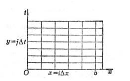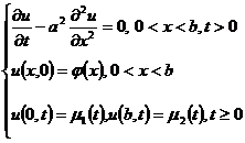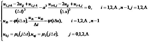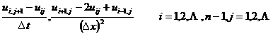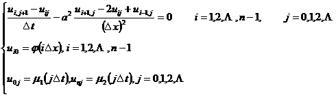 由此可按t增加的方向逐排求解.在第0排上ui0的值由初值(ix)确定,j+1排ui,j+1的值可由第j排的三点(i+1,j),(i,j),(i-1,j)上的值ui+1,j, uij,ui-1,j确定,而u0,j+1,un,j+1已由边界条件1((j+1)t)及2((j+1)t)给定,于是可逐排计算一切节点上的uij值.当(x), 1(x)和2(x)充分光滑,且时,差分方程收敛而且稳定.所以利用差分方程(1)计算时,必须使