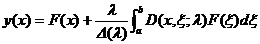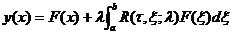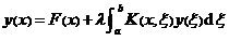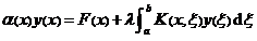 called the integral equation. where α ( x ), F ( x ) and K ( x, ξ ) are known functions, λ , a, b are constants, variables x and ξ can take all values within the interval ( a, b ) ; K ( x ) , ξ ) is called the kernel of the integral equation, F ( x ) is called the free term, and λ is called the parameter of the equation. If K ( x, ξ ) is a symmetric function with respect to x, ξ , equation (1) is said to be an integral equation with a symmetric kernel; if the unknown function in the equation is first-order, it is called a linear integral equation, equation (1) is the general form of a linear integral equation; if F (x ) ≡ 0 , then equation (1) is called a homogeneous integral equation, otherwise it is called an inhomogeneous integral equation.