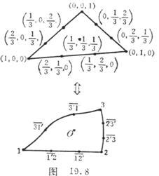 [ Nine and ten-node triangles ] The nine-nodes include the three vertices of the triangle and the thirds of the three sides ; the ten-nodes should be supplemented with the centroid O of the element ( Figure 19.8), and its area coordinates are .