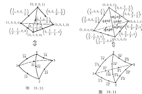 [ Twenty-noded tetrahedron ] Twenty-nodes include the four vertices of the tetrahedron, the three-points of the six edges ( 12 in total ) , and the centroids of the four boundary surfaces ( such as 4 in total ) ( Fig. 19.11 ) . Its type function is: