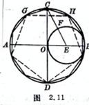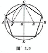 [ The circumscribed circle is known as a regular pentagon ] Through the center O , draw the diameters AB and CD that are perpendicular to each other , bisect OB at E , take E as the center, EC as the radius, and draw an arc intersecting OA at F , with CF as the radius on the circumference Sequentially truncate and connect the points, that is, the required regular pentagon ( Figure 2.5 ). You can also refer to the regular decagon method ( see the dotted line in Figure 2.11 ).