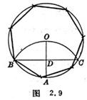 [ The known circumscribed circle is a regular heptagon ( approximate method )] Taking any point A on the circumference as the center of the circle, with the radius of the same circle as the radius, draw an arc to intersect the circumference at B , C , connect BC , AO , and intersect at D. Take BD as the radius ( It should be slightly larger than BD when drawing ) Cut sections in sequence on the circumference, and connect the points, that is, the required regular heptagon ( Figure 2.9 ).