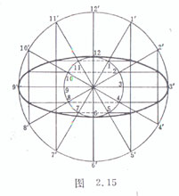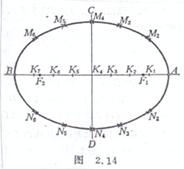 [ Focus method ] The same as the trajectory method , first draw a point , divide AB 8 equally, each point in the middle is the center of the circle, draw an arc for the radius, draw the arc for the center of the circle, draw an arc for the radius, and the two intersect at the sum . Then connect these intersection points together with A and B with smooth curves in turn, that is, approximate the desired ellipse ( Figure 2.14 ).