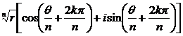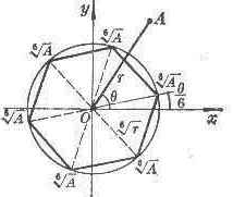 Geometric Explanation: The points on the complex plane that correspond to the nth root of the number r ( cos θ + i sin θ ) are the vertices of a regular n - gon , and these vertices are on a circle with the origin as the center and the radius . And One of the vertices of this n -gon has an argument . Figure 3.1 shows the case of n = 6 .