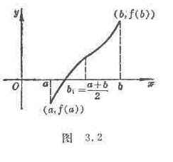 Assuming that f ( x ) is continuous on [ a, b ] , and f ( a ) f ( b )<0 (here it is assumed that f ( a )<0, f ( b )>0 ) , take the interval [ a, b ] The midpoint of , if = 0 , then the root of f ( x )=0 is ξ = . Otherwise, if > 0 , then let a 1 = a , b 1 = ; if < 0, then let a 1 = , b 1 = b . Then a new interval [ a 1 , b 1 ] is formed , which contains the root ξ of f ( x ) = 0 (Fig. 3.2 ) .
