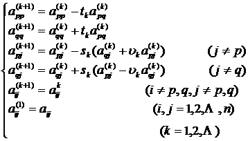Because under this rotation transformation, the elements located at the intersection of the pth row and the qth column ( p 1 q ) in the matrix are eliminated (see this section, five), while the sum of the squares of all the elements of the matrix remains unchanged, and the diagonal The sum of squares of the elements on the line increases, so the sum of squares of the off-diagonal elements decreases. Therefore, when the number of rotations is large enough , the absolute value of the off-diagonal elements can be made small enough . For a given The accuracy of e > 0 , if | a ij | < e ( i 1 j ), then a ij ≈ 0. Then a specific iterative method for finding the eigenvalues and eigenvectors of matrix A is obtained .