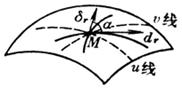 For surfaces represented by parametric or vector expressions, if a series of numerical values L is taken and u is continuously changed, then r ( u , )( i =1,2, L ) represents a family of curves, called u -lines (Figure 7.23 ). ); similarly, if u is a series of values u 1 , u 2 , L , and let it vary continuously, then r ( u i , )( i =1,2, L ) represents another family of continuous curves, called lines . The u line and the line form a curve network on the surface, which is called coordinate line or coordinate network . So u = u i ,