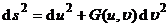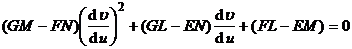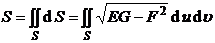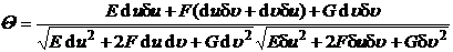 In the formula, E , F , and G are the first basic quantities of the surface ( valued at point M ). The intersection angle of the coordinate lines u = constant and v = constant is determined by the necessary and sufficient conditions for the orthogonality of the coordinate lines to be: