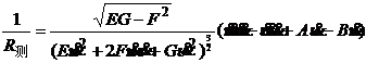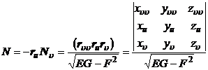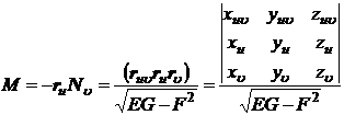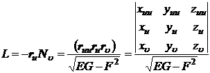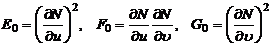 In the formula, the partial derivative takes values at the point , E , F , and G are the first basic quantities, and N is the normal unit vector of the surface at the point M.