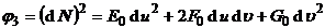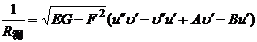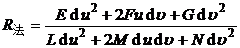 ds2=Edx22fdxdy+Gdy2 in the formula E=1+ F= G=1+ d s is the differential of the arc at the point M ( x , y , z ) , d s 2 is called the first fundamental quadratic form, E , F , G are called the first fundamental quantity ds2==Edu2+2Fdud+Gd2 in the formula E= F= G= The first fundamental quantities E , F , and G all take values at point M. The first fundamental quadratic form of every point (except singularity) on the surface is positive definite, i.e. E>0,G>0,EG-F2>0 |