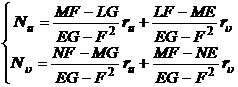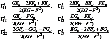 where E , F , G and L , M , N are the first and second fundamental quantities of the surface, respectively; the six coefficients are called the Christopher notation of the second kind of the first fundamental quadratic form, and their expressions are equations The group ( 1 ) is called the partial differential equation of the surface, also known as the Gauss formula; the equation group ( 2 ) is called the External Ingledon formula; ( 1 ), ( 2 ) are collectively called the basic formula of the surface, the characteristics of these formulas Yes, the derivative of a vector is expressed as a linear combination of the vector itself, and its coefficient is only related to the first and second fundamental quantities of the surface .