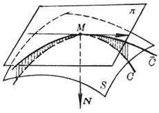 [ Geodesic curvature and Beltrami formula ] Let M be a point on the surface S , C be a curve passing through the point M on S , be the tangent of S on M , and be the orthoprojection of C on , then the curvature of M Called the geodesic curvature of C at M , denoted as .
