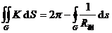 [ Gaunier - Bornne formula ] Let G be a single connected region on the surface S , the boundary C of G is a closed curve that is smooth piece by piece and has no self-intersection points, and its running direction is that G is always on its left side .