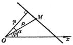 O is the pole, Ox is the polar axis, p is the distance from the pole to the line . a is the angle between the polar axis and the vertical line leading from the pole to the line ( positive counterclockwise ) , j is any point on the line Polar angle of M, r is the vector radius of point M
