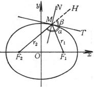 The tangent line bisects the outer angle (i.e. ∠ F 1 MH ) between the two focal radii of point M ( i.e. a = b , ) , and the normal MN of point M bisects the inner angle ( i.e. ∠ F 1 MF 2 ) ( Figure 7.3 ) .